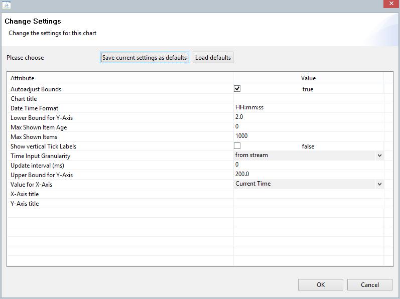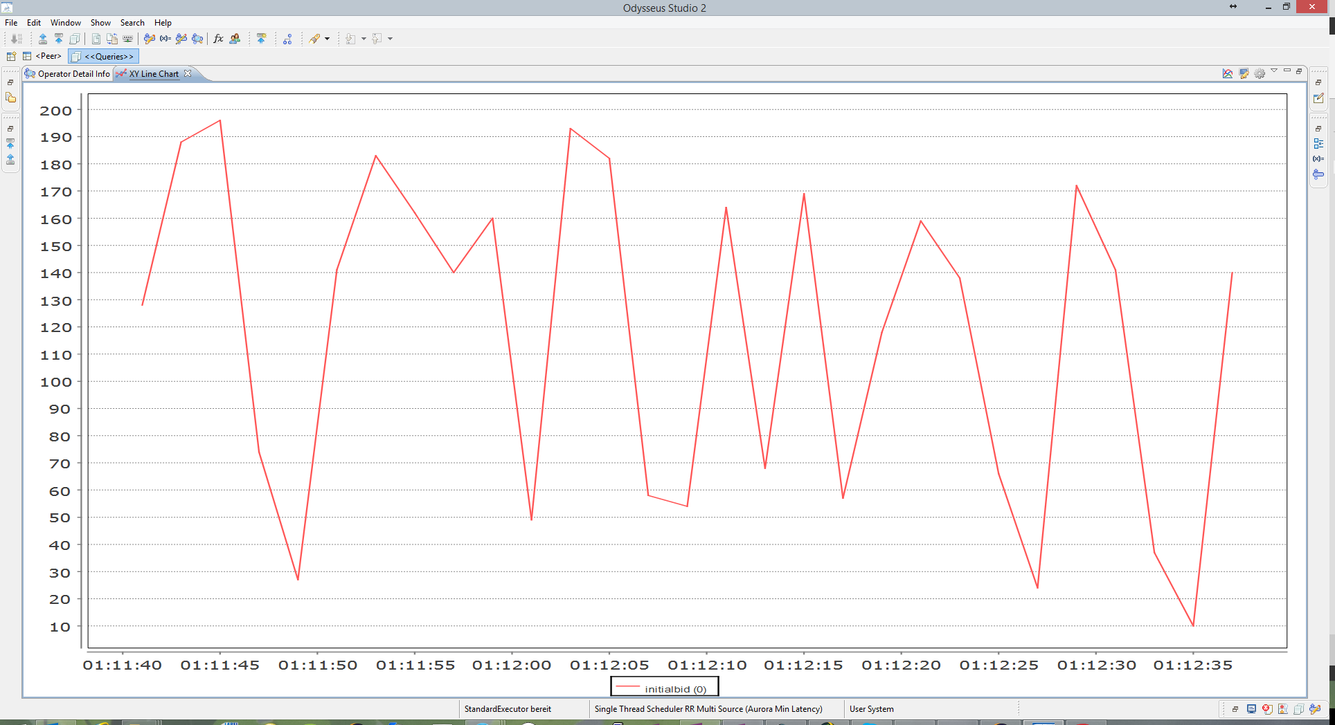 On the left side you see all attributes that are available for selection and on the right side visible and groupBy marker. Visible means, that this attribute is show in the diagramm. So to show how the initial bids of auction behave, select button "Deselect all" and choose the attribute nexmark:auction.initialbid(0). (Ignore the (0) in this case). After pressing OK, the diagramm will be created new with only one value.