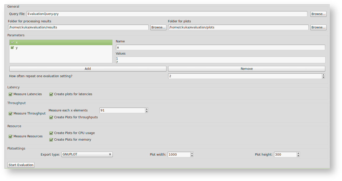The evaluation feature offers some graphical user interface and instrumentation to measure the latency and throughput of a given query and to create some plots.