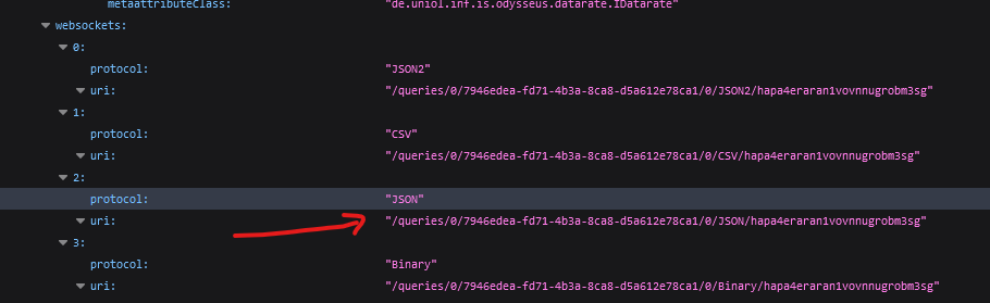 You will need to determine the websocket address manually by using a webbrowser (we recommend Firefox because of better JSON presentation) (http://localhost:8888/queries/<nr>) and find the section websockets with protocol JSON and use the entry with uri for creating panels in grafana: