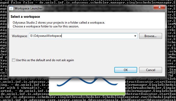 At the first start, you have to choose a workspace. This workspace is a directory where all Odysseus projects will be stored.You can also check the "Use this as the default.." option so that this dialog will not pop up at the next start of Odysseus.