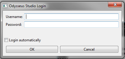 Next, Odysseus asks you for a user and a password. The default user is "System" with password "manager". You can also check "Login automatically" so that username and password is saved and used automatically at the next start so you don't have to type in your login data again. In some cases there may be a field "Tenant". For most cases this field should be empty.