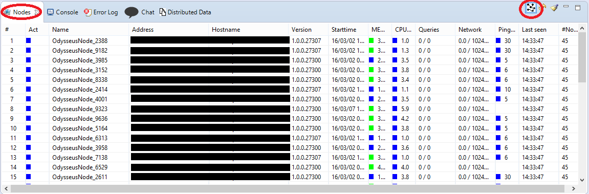 Only when OdysseusNet is activated, the functionality for distributed data stream processing is available. There are multiple possibilities to activate it. If the graphical user interface OdysseusStudio is available, the user can switch to the OdysseusNet Perspective. There in the NodeView, the user can click on the button in the top-right corner to activate OdysseusNet (marked with red circles in the picture below).