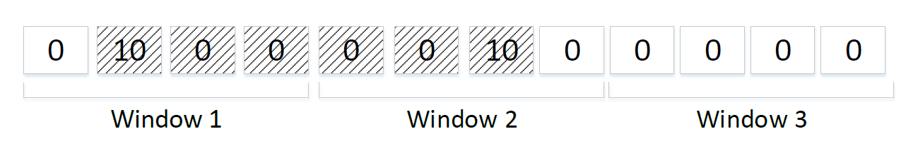 The windowChecking option allows the operator, to use a window and check, if there is at least one anomaly in that window. If the data stream has anomal phases where some tuple may are "normal", these "normal" tuples can be marked as anomalies if they are between two windows which have both at least one anomaly. The figure below explains that behavior. The squares are tuples, each tuple is in exactly one window (a tumbling window is used). The tuples with a 0 are normal tuples, the tuples with a 10 are anomal tuples. With the option "windowChecking = true" the tuples between those two anomalies are also marked as anomalies and are therefore in the output stream.