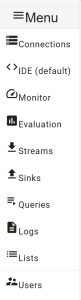 For all registered connections, the sources, sinks and queries can be found under "Streams", "Sinks" and "Queries" resp.