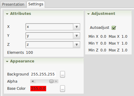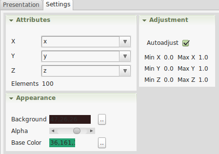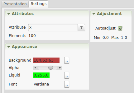 In the settings the stream attribute has to be selected. The maximum number of elements is needed to estimate the minimum and maximum value used to draw the current fill height. In the appearance section, the background color, the transparence alpha value, the liquid color, and the font can be selected.