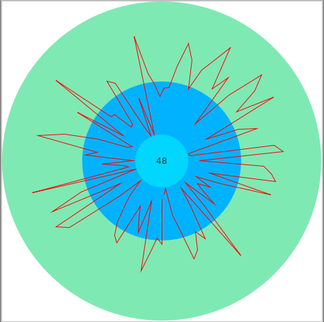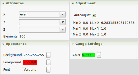 The wheel chart transforms the selected attribute value into circle coordinates and plots them on a wheel.If the autoadjust setting is enabled, the value will be normalized to 360 degree. In addition you can set the fore- and background of the chart.