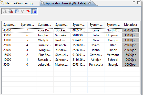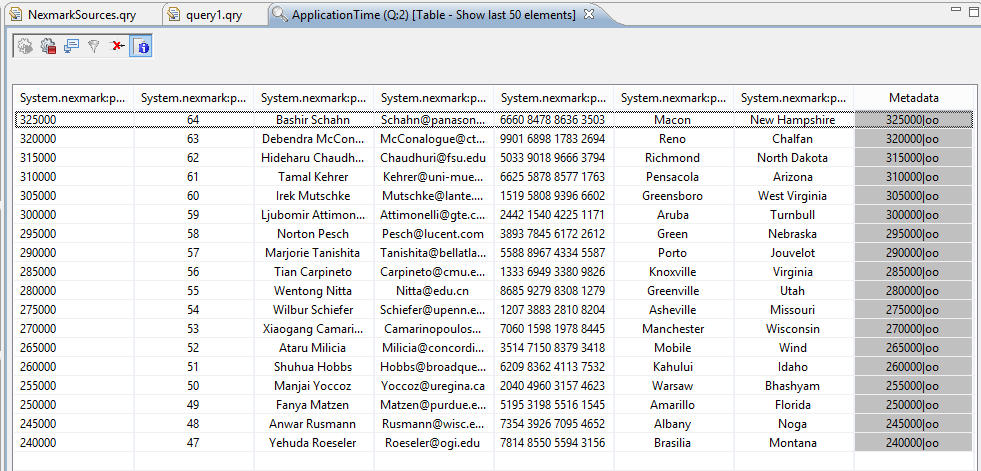 There are two types of parameters here. The first part is the physical connection to the server (We will not describe all parameters here (see Access framework for further information).If you have started the nexmark server on another machine change 'host' and if you started the person server on another port change 'port'.) and the seconds part describes the information this souces delivers.