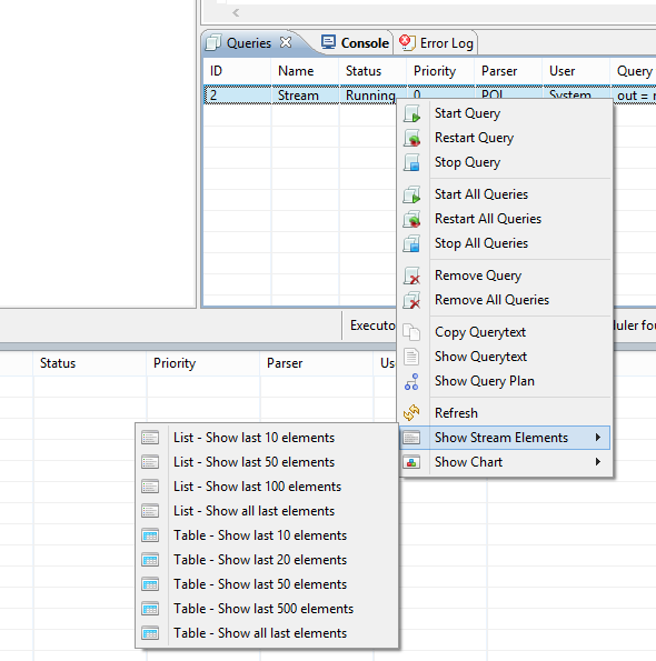 You can also start and stop queries with the elements in the toolbar by choosing the seconds and the fourth button. Restaring (third button) is the same, as stopping and starting a query.