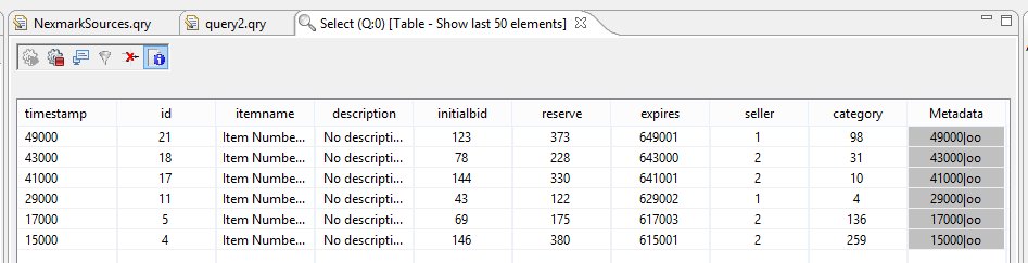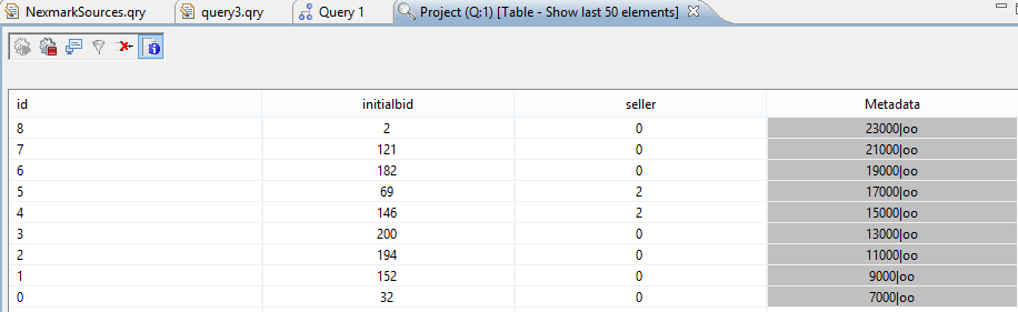 out = PROJECT({ATTRIBUTES=['id', 'initialbid', 'seller']},nexmark:auction)