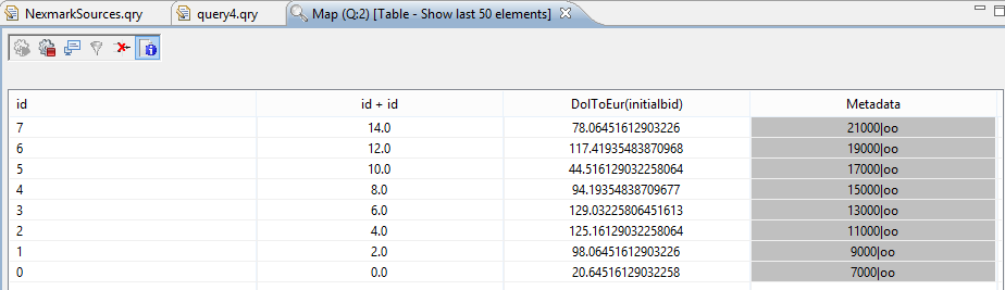 out = MAP({EXPRESSIONS=['id',['id+id','DoubleId'],['dolToEur(initialbid)','Bid €']]},nexmark:auction)