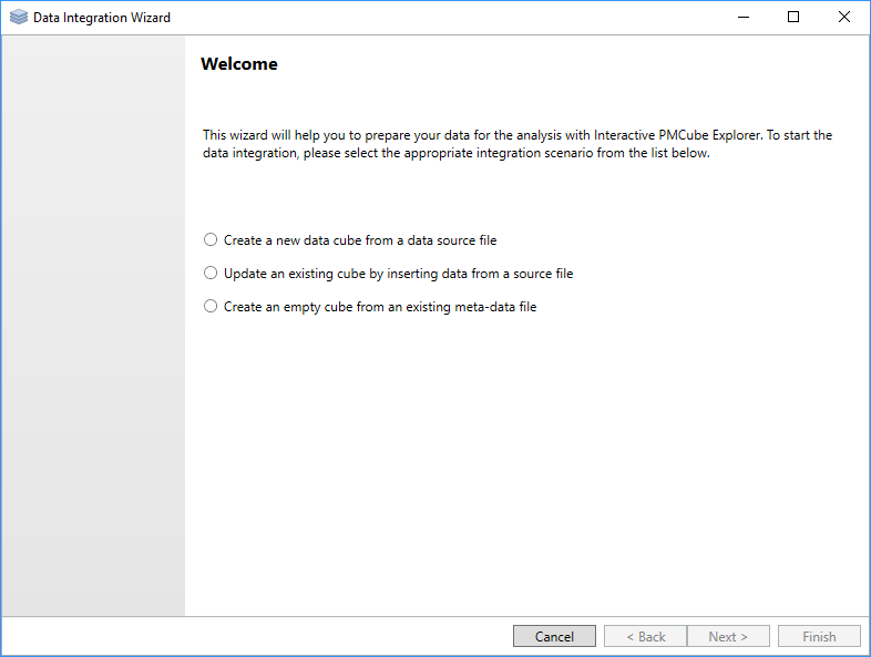 - Create a new data cube from a data source file (Full Integration): In this scenario, the wizard will guide you through the full integration process. Assuming that you have an event log file (e.g., XES), it will create the cube structure in the database from scratch and populate it with the data of your data source.
