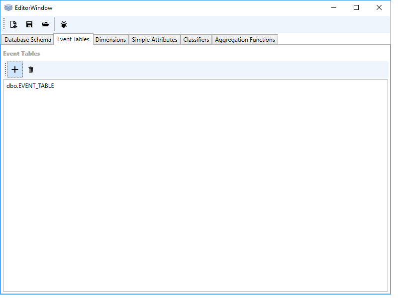On the Event Tables Tab you must select the database tables which represent the event tables of the data cube. To select an event table, you need to click on and select the database table from the dialog.