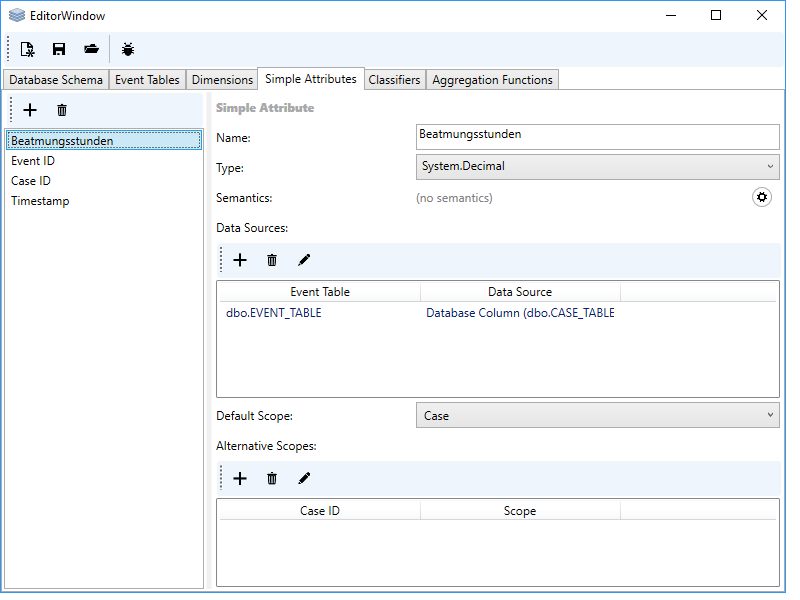 On the Simple Attributes tab, you must define all simple attributes of the data cube. On the left side of the tab, all simple attributes are presented in a list. You can add a simple attribute by clicking on in the toolbar above. For a simple attribute, you can edit the following properties:
