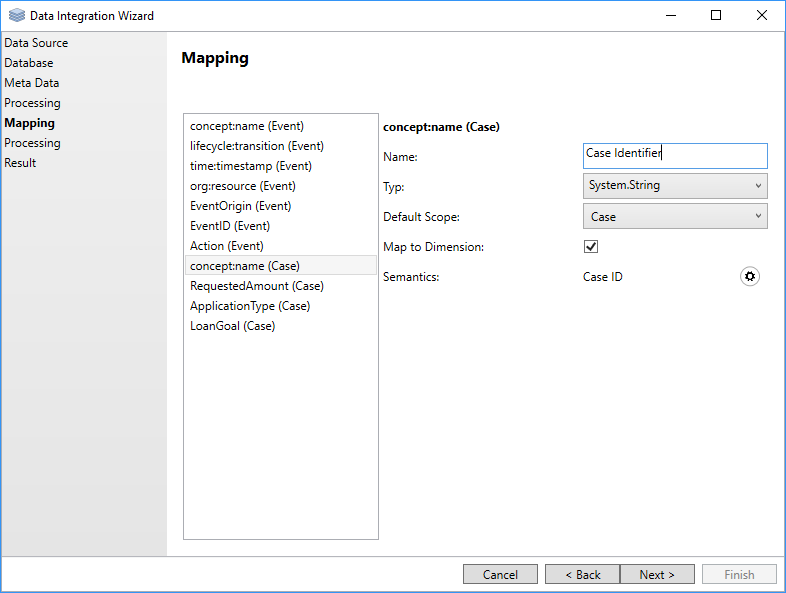After analyzing the data source structure, the Mapping page will show up where you must define how the attributes of the data source are mapped to the attributes (i.e. dimensions and simple attributes) of the data cube. On the left side of the page, all attributes of the data source are presented in a list. On the right side of this list, the mapping of the selected attribute to the target data cube attribute is shown. According to the configuration in the previous steps, the wizard automatically creates an initial mapping which should be fine for most of the attributes. However, you may need to correct the mapping or adjust it to your needs. For each attribute of the data source, you will find the following configuration options for the target attribute of the data cube: