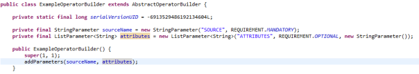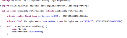 The constructor asks for two integers: minPortCount and maxPortCount. These integers are equal to minInputPorts and maxInputPorts like they are described in the annotation (see previous section). Thus, they indicate the minimum and maximum number of incoming data ports (e.g. a selection has exactly min=max=1 port). Thus, you should pass your numbers in you constructor to the super constructor, for example, super(1, 1) if you have exactly one port. The next step is the definition of parameters. A common way is to declare and initialize each parameter of type IParameter as a class field and finally to announce the parameter by using the addParameter method in the constructor. This is shown in the following for a StringParameter called sourceName.