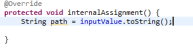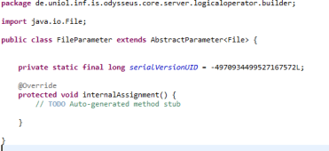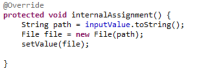 You may also generate a serial version uid and create the method stub for the one needed method called internalAssignment(). This method is responsible for transforming the value that is given by the user into the output format (in our case File). We assume that the user provides a string that holds a path. We can access this value via the inputValue variable, so that we are casting this value to string: