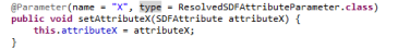 ResolvedSDFAttributeParameter is similar to the previous one but is used to lookup an existing attribute instead of creating a new one. If you have an operator that needs one of the attribute from the input schema this type can look up the attribute. For example, if you have an input schema like (time, value, bid, id) this parameter allows the use to write parameters like param='bid' to choose one attribute from the schema. Like the previous one, it also delivers an SDFAttribute for your setter method.