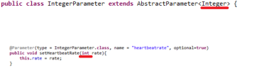 The generic type of AbstractParameter (in this case Integer) describes the Java class that the Parameter provides. Therefore, the parameter IntegerParameter is responsible for translating a user defined value (in PQL) into a Java-based class. This class is exactly the same type of the setter (in our example int rate). Remember in this example, that Java provides auto boxing between classes and primitive data types and converts an Integer object automatically to int. Summing up, this means, that the following data types have to be equal (or at least convertible):