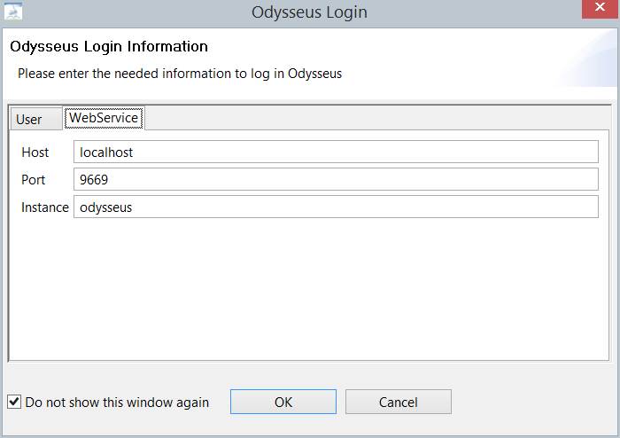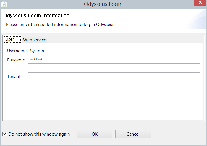 Next, Odysseus asks you for a user and a password. The default user is "System" with password "manager". You can also check "Login automatically" so that username and password is saved and used automatically at the next start so you don't have to type in your login data again. In some cases there may be a field "Tenant". For most cases this field should be empty.
