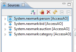 The queries will access sources that deliver events. In our example we will connect to the already started nexmark server. In this examples we will use PQL to create the sources. For detailed information about source definitions see The Odysseus Access Operator Framework