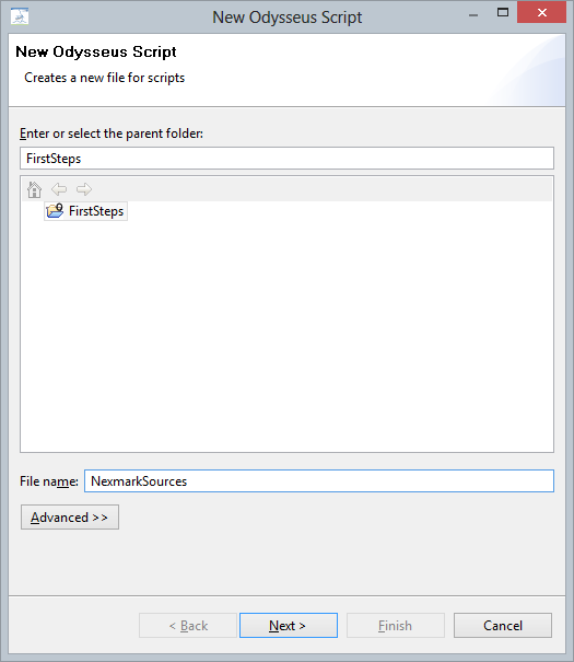 Now we are ready to formulate queries over the nexmark sources. For this, create a new Odysseus Script file named query1 the same way as above.